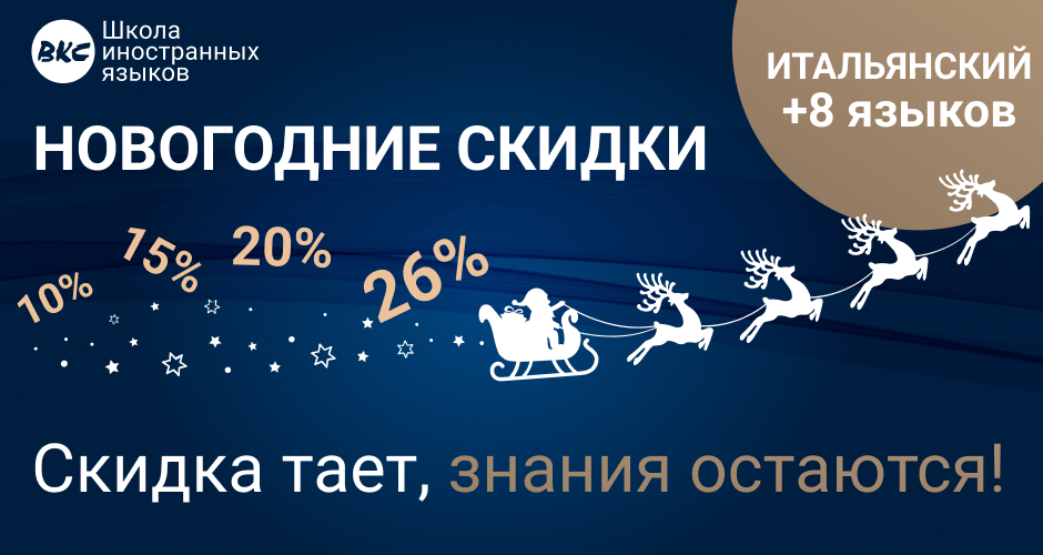Мы приготовили настоящий новогодний сюрприз для всех, кто уже учит иностранные языки или только собирается начать – скидку до 26% на обучение итальянскому и другим языкам.